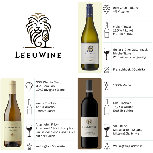 Wir bei LeeuWine haben es uns zur Aufgabe gemacht, die einzigartigsten und besten Boutique-Weine aus Südafrika für Dich zu entdecken. Im direkten Austausch mit den Winzern vor Ort finden wir genau die Tropfen, die deinen Geschmack treffen. Stöbere durch unser Sortiment und genieße das Beste, was Südafrikas Weinwelt zu bieten hat!
