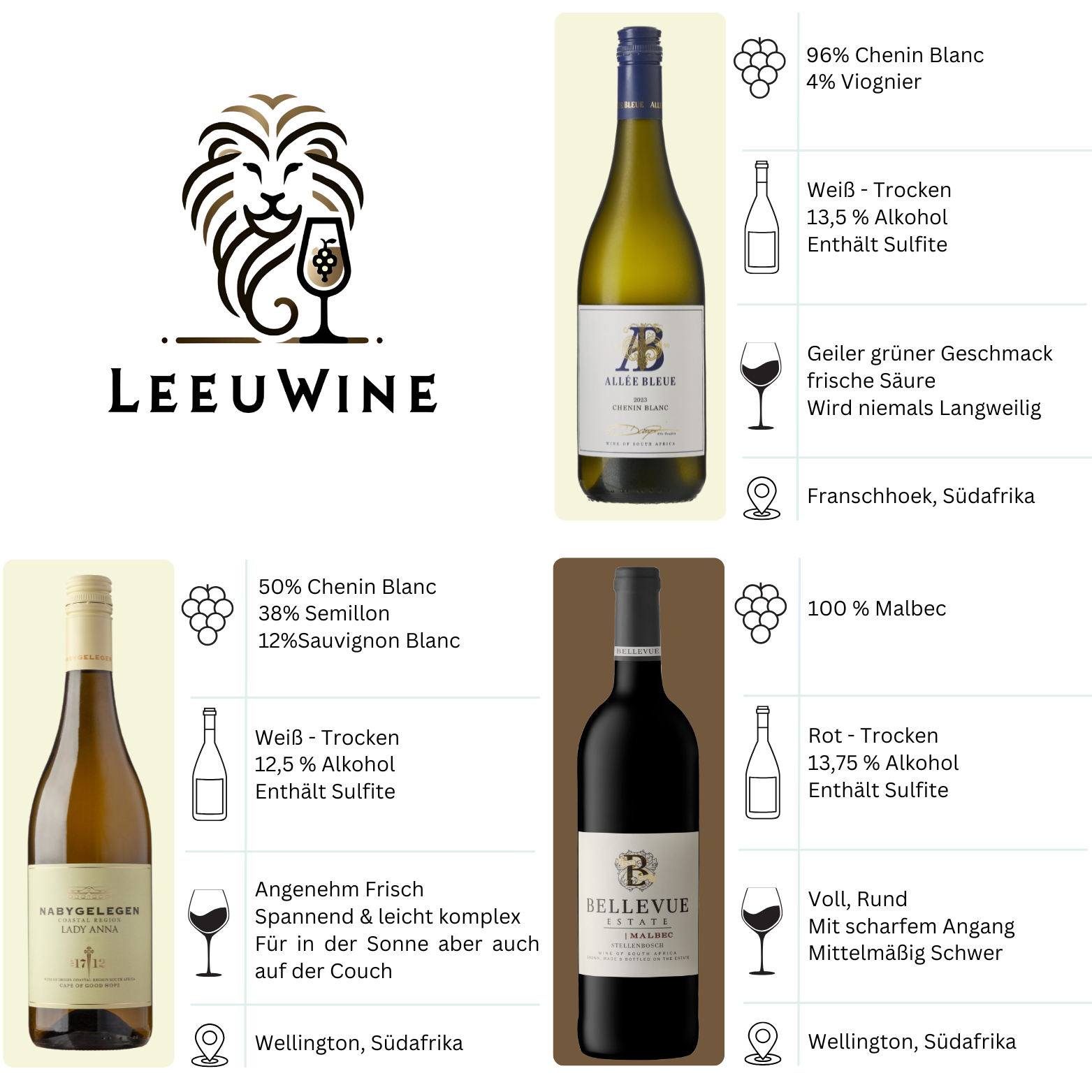 Tauche ein in die faszinierende Weinwelt Südafrikas mit unserem exklusiven "Entdecker Set". Dieses sorgfältig zusammengestellte 3er-Set bietet dir eine Auswahl, die jeden Weinliebhaber begeistern wird – egal, ob du Kenner oder Neuling bist. Jeder Wein erzählt seine eigene Geschichte und beeindruckt dich mit herausragender Qualität und einzigartigen Aromen.