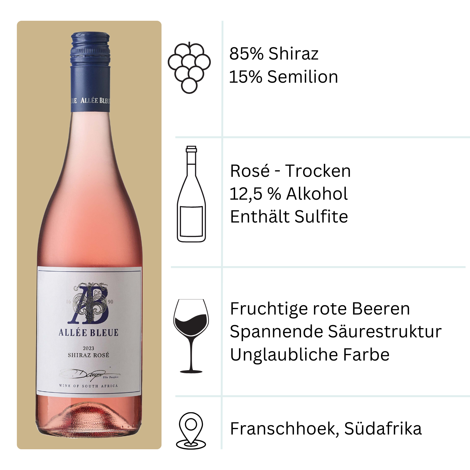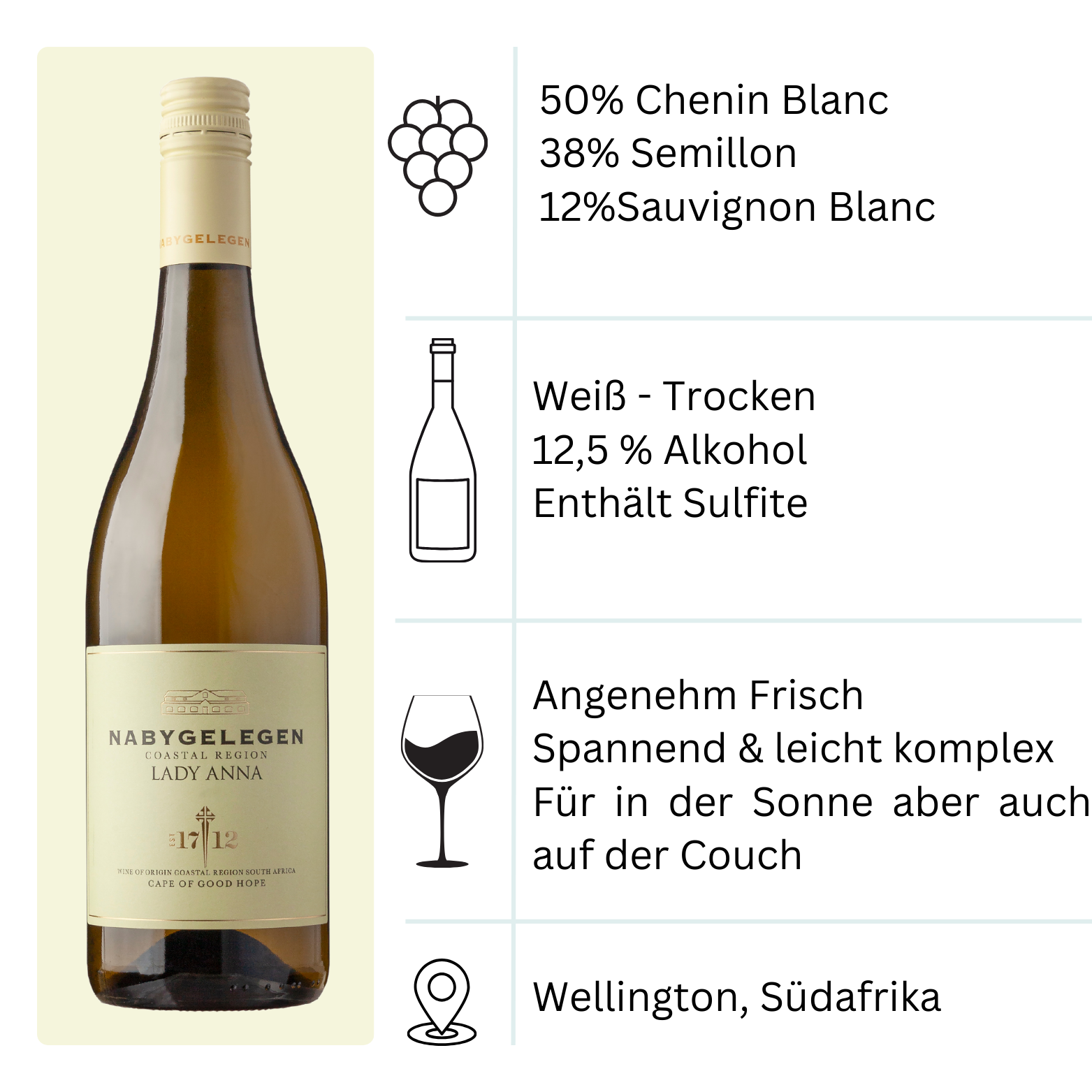 Malbec ist die Rebsorte, in die ich mich in Südafrika verliebt habe. Aber Südafrika kann so viel mehr als nur die Klassiker. So versteht es Nabygelegen wie niemand anderes, leichte und alles andere als langweilige Sommerweine zu kreieren. Für noch mehr sommerliche Gefühle rundet der Shiraz Rosé meinen perfekten Sommerabend ab. Ein Gewürztraminer aus Südafrika? Ein Erlebnis, das sich nach Honig auf der Zunge anfühlt. Leichter Genuss oder schwerer Rotwein – mit dem Cabernet Franc und dem Cabernet Sauvignon liegt die Wahl bei dir. Ich freue mich auf dein geschmackliches Feedback. Cheers!