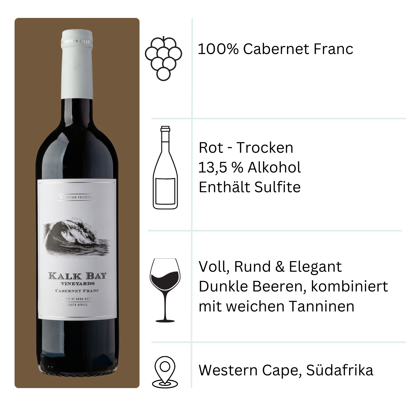 Weiter geht es mit dem Kalk Bay aus der exklusiven Artisan Collection. Dieser einzigartige Cabernet Franc im Chinon-Stil wird nur in streng begrenzten Mengen produziert und stammt aus edlen Reben direkt hinter dem Kaffee Olympia in Kapstadt. Mit seinem seltenen und edlen Charakter ist der Kalk Bay eine wahre Rarität, die nur wenigen Weinliebhabern vorbehalten bleibt.